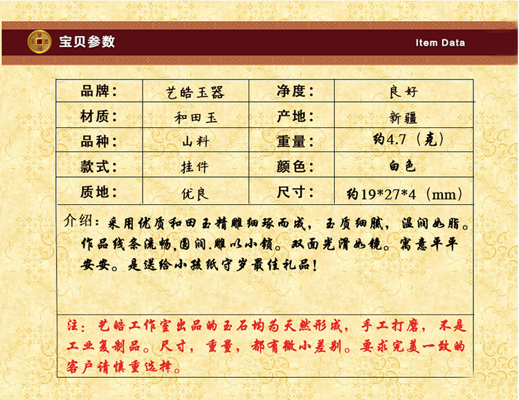 艺皓天然精品精工和田玉岁岁平安手把件 车挂 带收藏证书