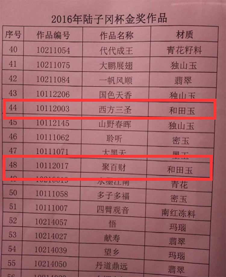 喜讯!喜讯! 艺皓玉器,镇平县皓玉珠宝有限公司。作品:西方三圣编号:10112003和作品:聚白财编号:10112017。两件作品荣获河南省2016年第十届陆子冈杯