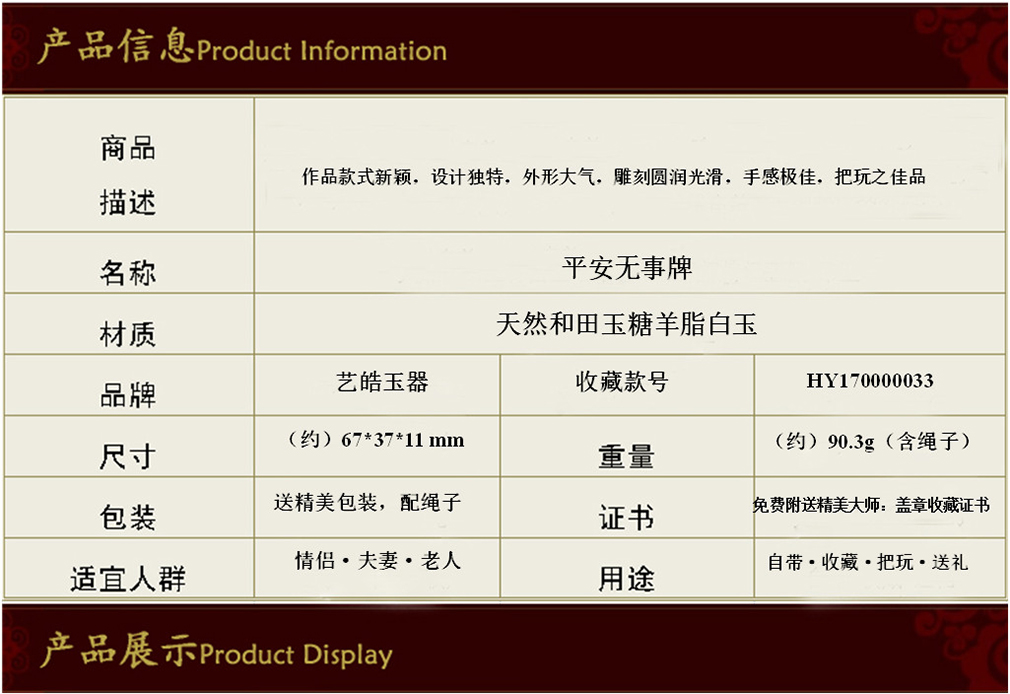 艺皓天然精品精工和田玉岁岁平安手把件 车挂 带收藏证书